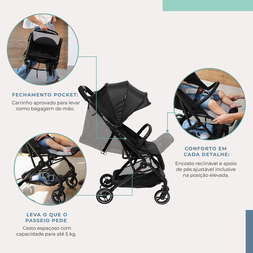 Indicado desde o nascimento até 15 kg, tem estrutura compacta, fechamento tipo pocket e pode ser levado como bagagem de mão, conforme os padrões da Associação Internacional de Transporte Aéreo.