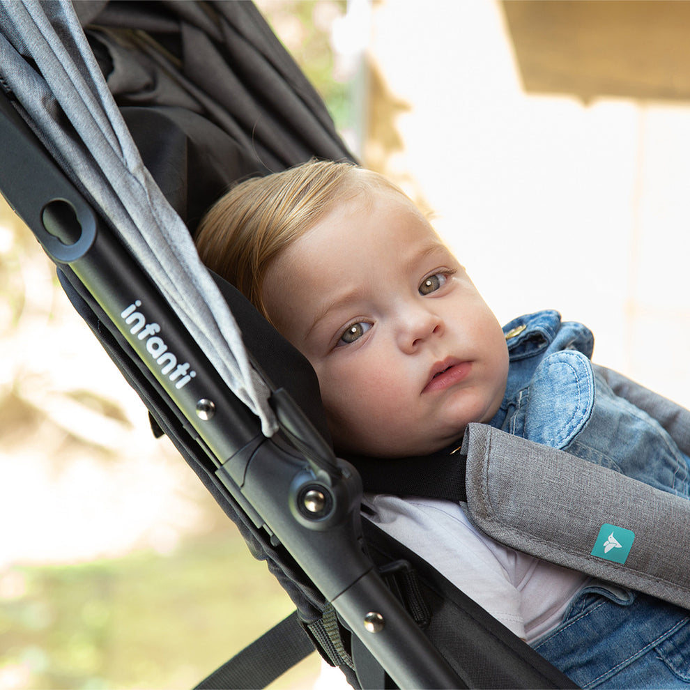 O encosto com múltiplas posições se ajusta às necessidades do bebê. A capota com visor, extensor e proteção solar UV50+ protege nos dias de sol, enquanto o apoio de pés ajustável com a posição inclinada para cima e a barra frontal removível oferecem mais conforto.